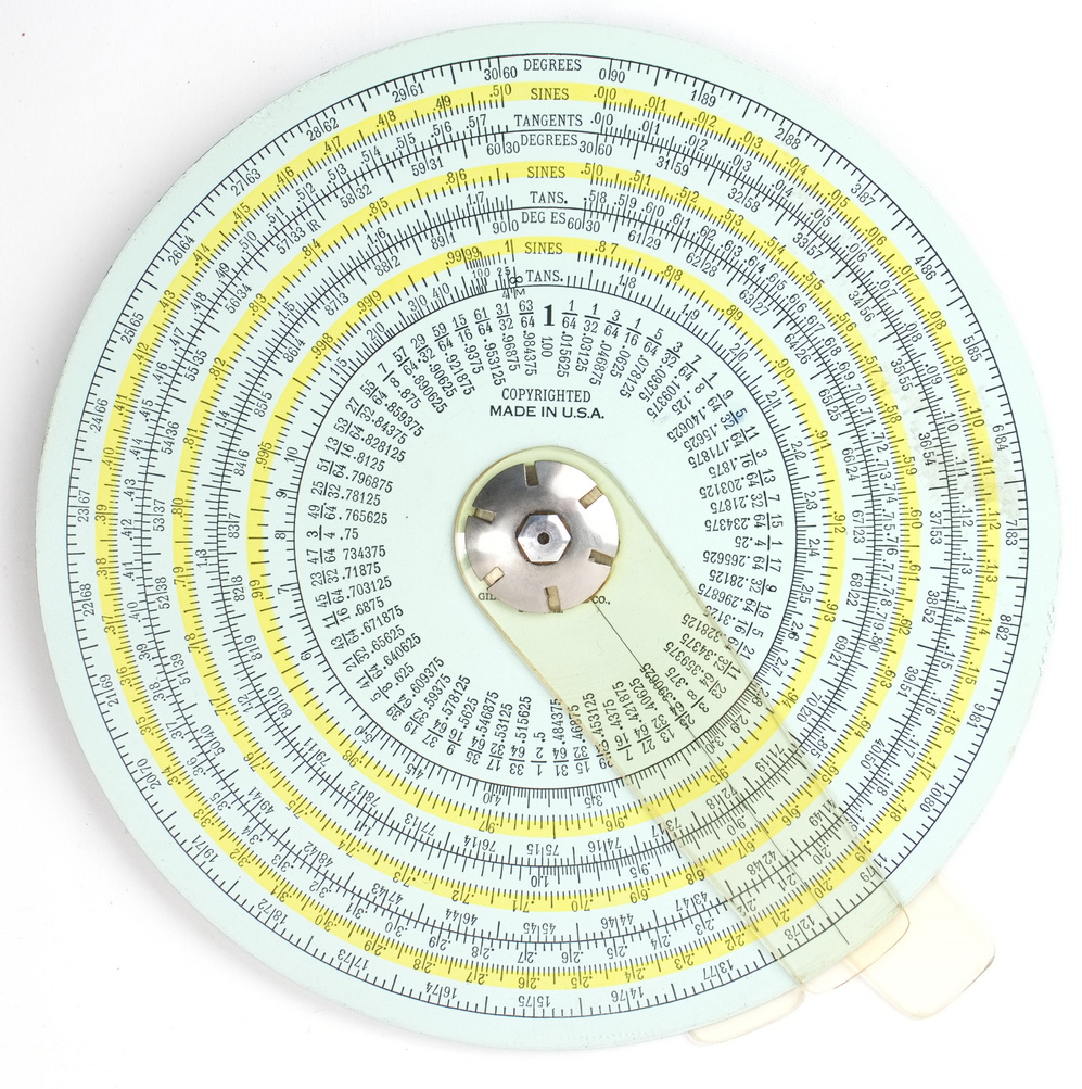 Gilson’s most famous aluminum circular slide rule, with alternating yellow/white stripes and fractional converter/operator scales. This rule was made by Gilson in Florida but was often sold by numerous other companies, including POST, Dietzgen, Tavella, Bruning and others.
