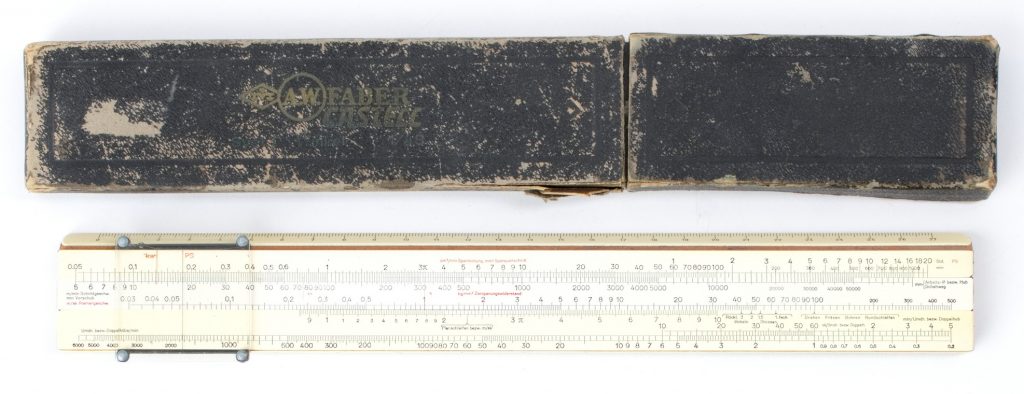 Long before Samsung was trying to sneak a stylus into their smartphones, Faber Castell was already concealing them in their slide rules. This is a very rare surviving example of one of those rules, that features a small stylus that is concealed in the upper left corner of the rule, and can be slid out to operate the addiator integrated into the back of the rule. Rule features an imperial ruler on the upper edge, and a metric ruler on the lower edge.