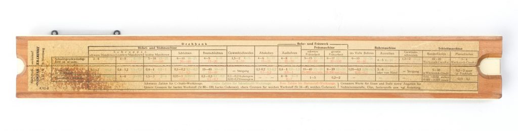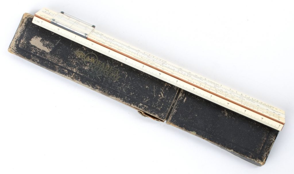 This is a very early, wood body, rule from Faber Castell prior to the advent of widely standardised scale markings. It features an imperial ruler along the upper edge, and a metric ruler on the lower edge, along with data charts and instructions on the revers side. Includes the original carton, two-piece case, and an English language instruction manual.