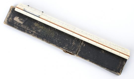 An unusual business rule in new condition, with original instruction manual, but missing its case. Scales are engraved and filled with red/black, as well as being self-documenting on the right side of the rule. Features an imperial rule on the upper edge, and specialist scales for currency conversion, and unit/measure conversions.