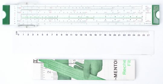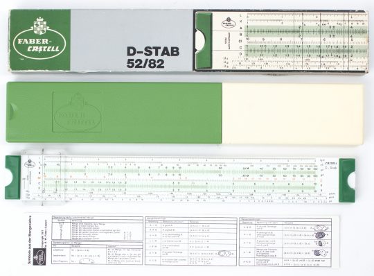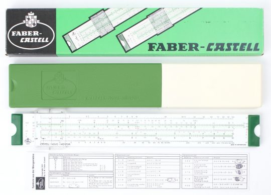 A beginner rule from Faber, featuring 5 cursor lines, an imperial ruler on the upper edge, and a reversible slide with additional scales. Comes with the original two-piece plastic case, and English instruction manual. Features the famous FC green scale contrast indicators, and black/red engraved scale markings. Moderate scale bleeding.