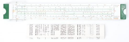 This 13-scale full size rule features large, color contrasted scale for easy reading, and operating instructions printed on the reverse side of the rule. Includes the original case and operating instructions (in German).