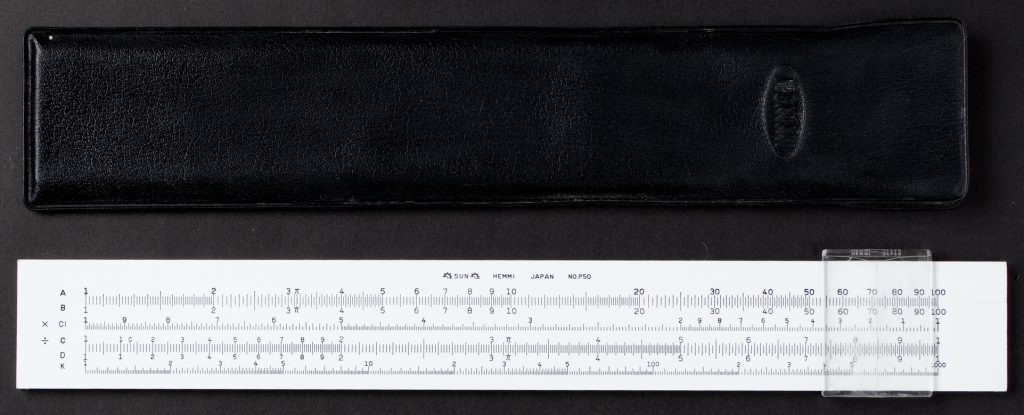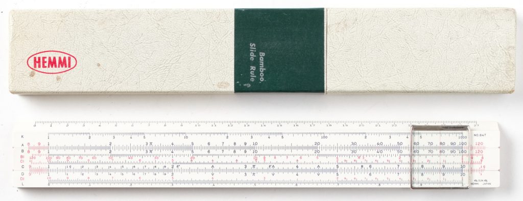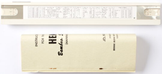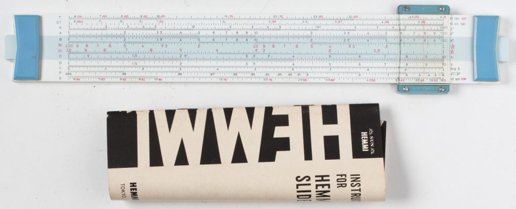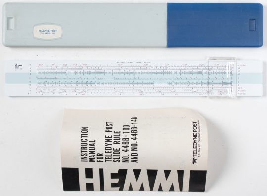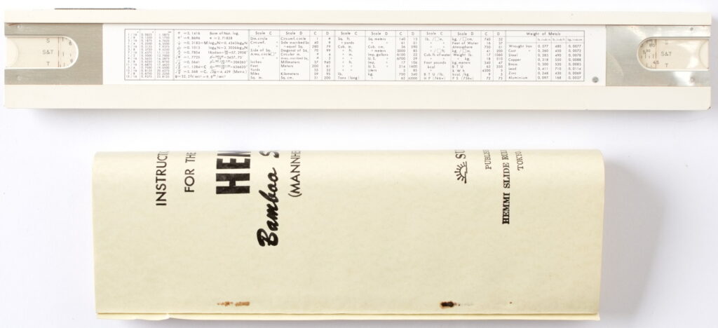 One side of the case may say Teledyne Post, but the other definitely says Hemmi. This is a beginner, single sided rule, that features feet on the reverse side for easier desktop use. We’ve only got one manual in stock, so not all rules come with manuals.