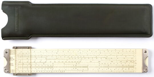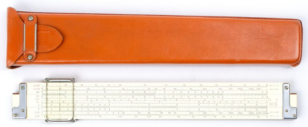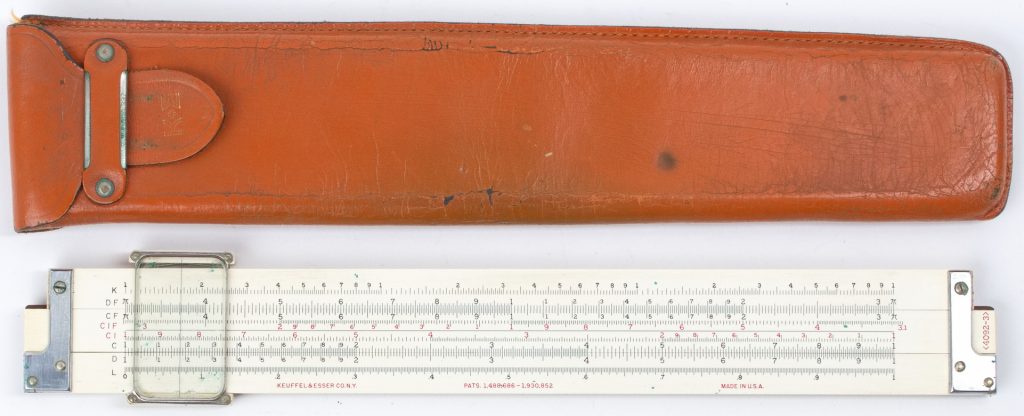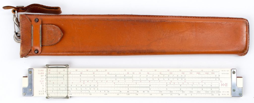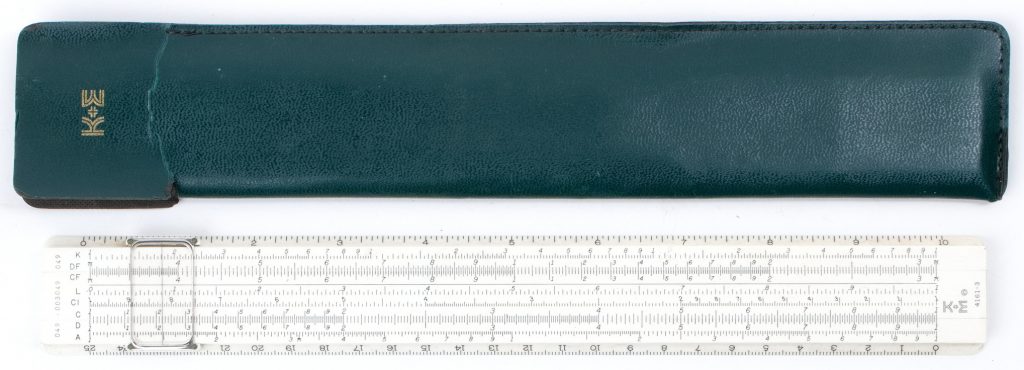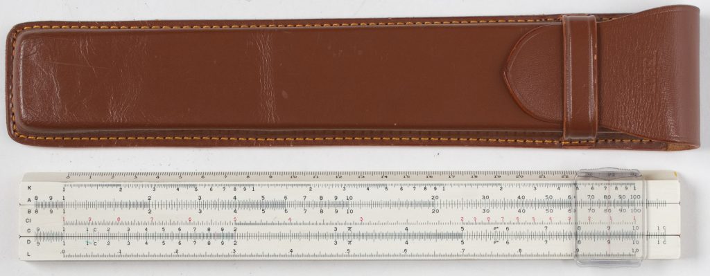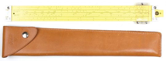 K+E’s famous Deci-Lon duplex rule, in very good condition. These cases are slightly different, being stitched/formed leather, as opposed to a folded/stitched leather case. Does not include any supplementary sheets or documents. This is K+E’s late production flagship rule, with unbreakable cursor, Ivorite body and adjustable frame, all free of marks, names or initials. Has 8 log log scales, a split square root scale, DI and folded scales. An outstanding and powerful rule, cleverly designed.
