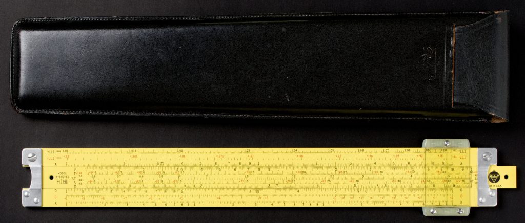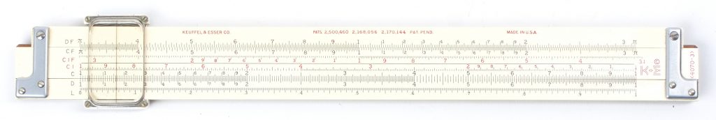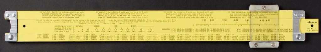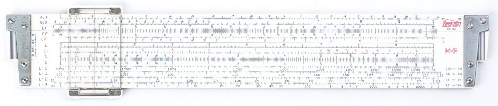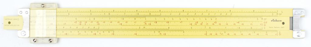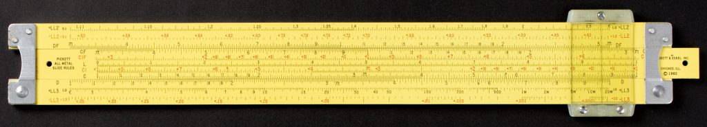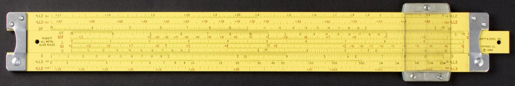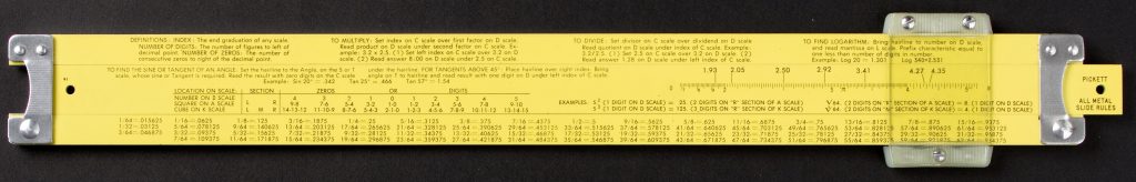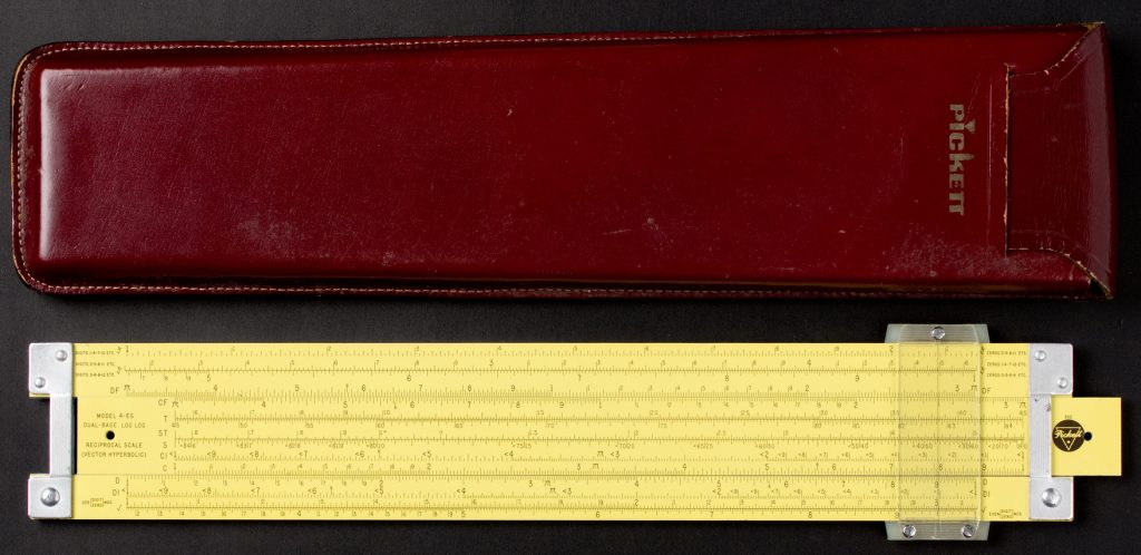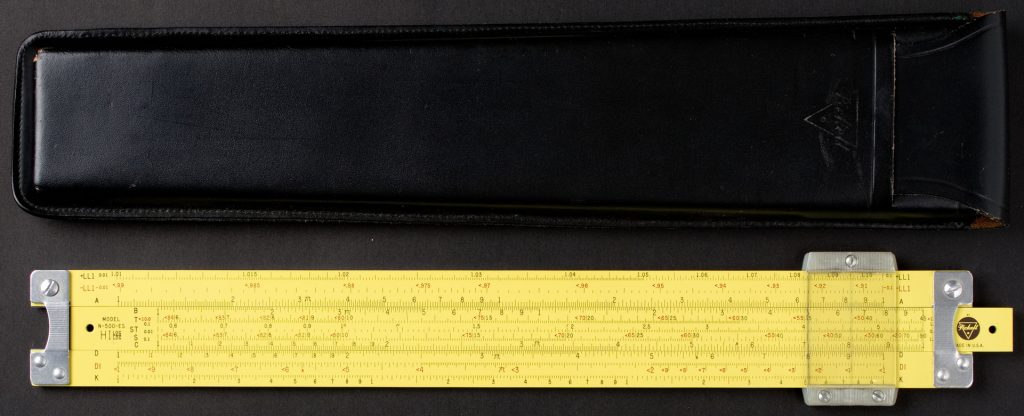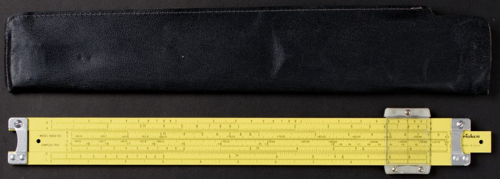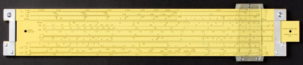ES (Eye-Saver) Yellow aluminum construction, high-quality American made, Pickett rule. An excellent student rule with good trig capability, that never loses its instruction manual (it’s printed on the back).