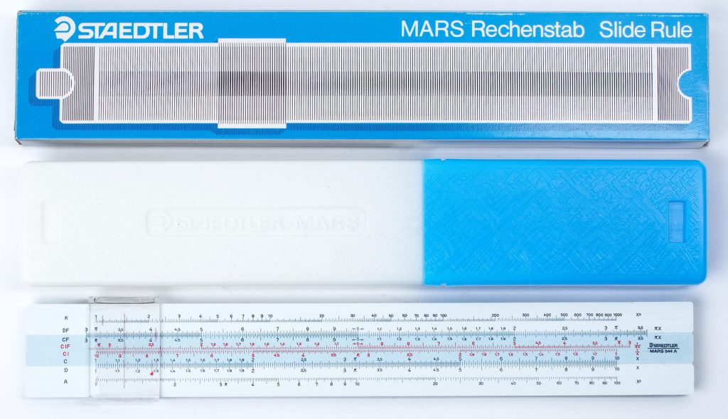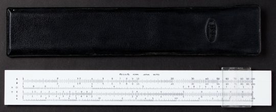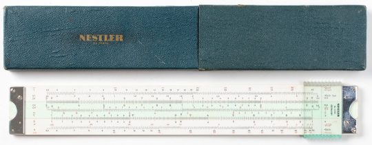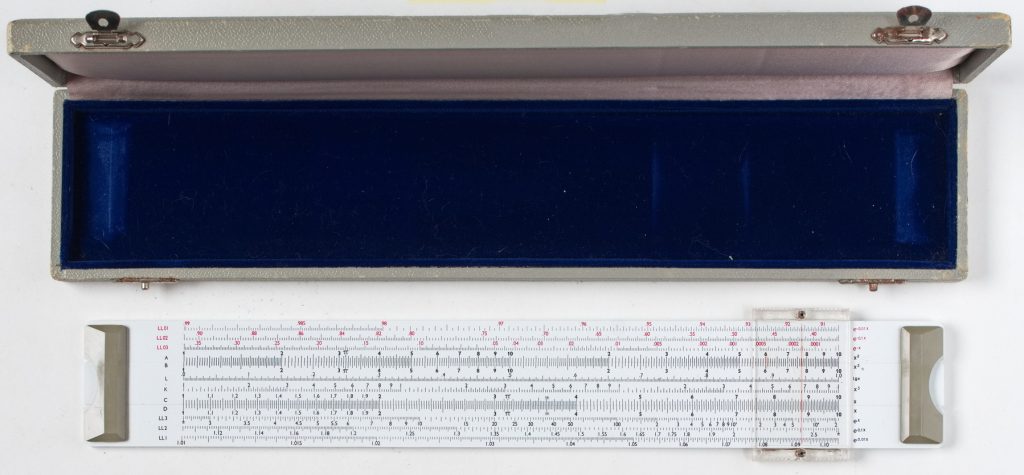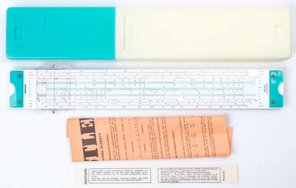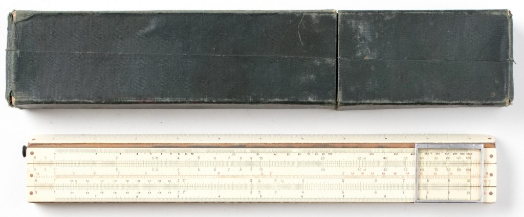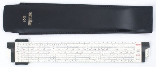 NIB, mint condition student/beginner rule with the original box, case, and manual (English). Scales are self-documenting on the right side of the rule. Features a metric ruler on the upper edge, and operating instructions on the reverse side of the rule.