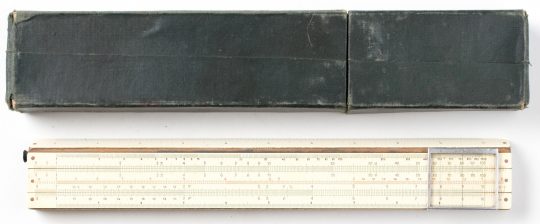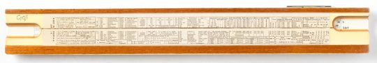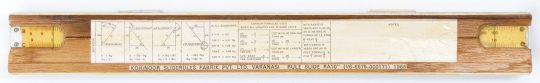 This is a very early, wood body, rule from Faber Castell prior to the advent of widely standardised scale markings. It features an imperial ruler along the upper edge, and a metric ruler on the lower edge, along with data charts and instructions on the revers side. Includes the original carton, two-piece case, and an English language instruction manual.