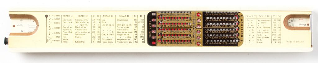 This is a rare variant of Faber’s advanced Mannheim rule, widely used in Europe, and features a stylus operated Addiator on the reverse side of the rule, along with reference data and formulas. This rule has a plastic body, with fine black and red filled and engraved scales, plus 1 side cursor and scale (L). Has a 5 line cursor. This is a very nice design, with a 2-sided cursor.