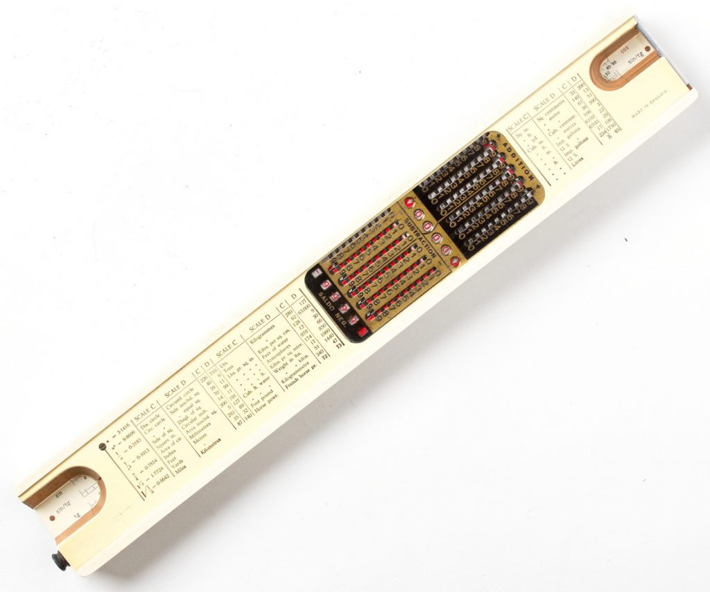 Long before Samsung was trying to sneak a stylus into their smartphones, Faber Castell was already concealing them in their slide rules. This is a very rare surviving example of one of those rules, that features a small stylus that is concealed in the upper left corner of the rule, and can be slid out to operate the addiator integrated into the back of the rule. Rule features an imperial ruler on the upper edge, and a metric ruler on the lower edge.