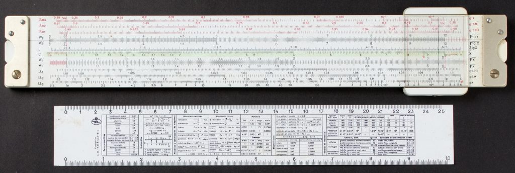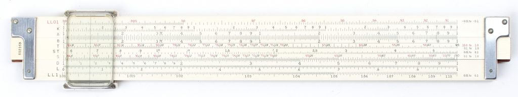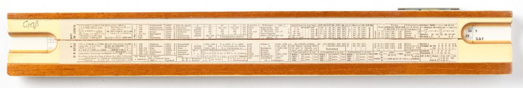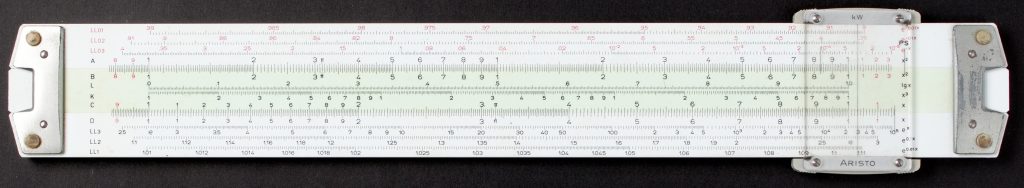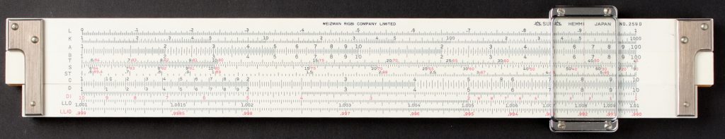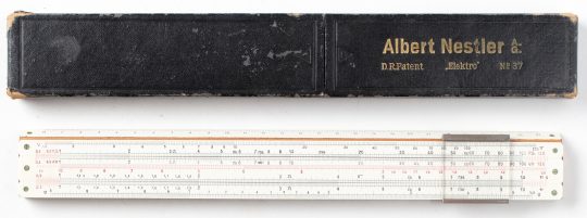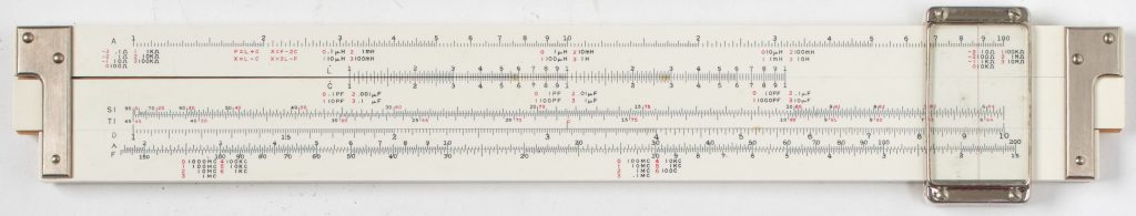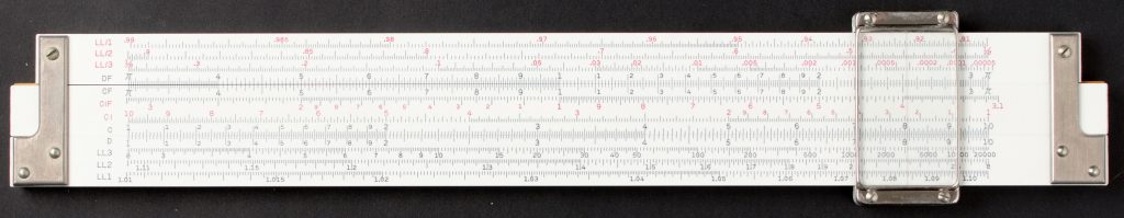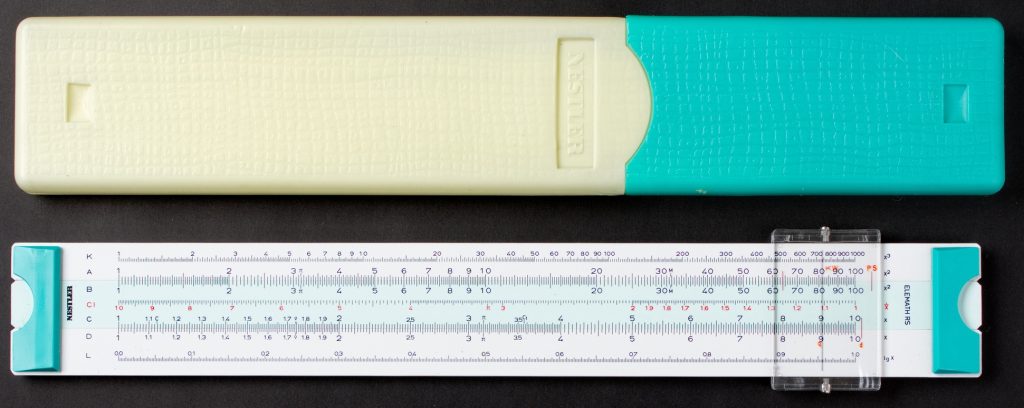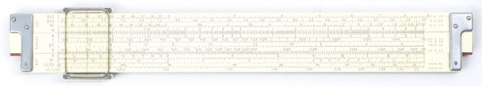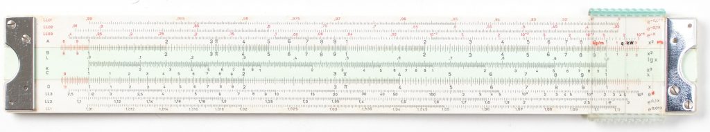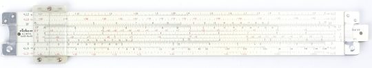 Faber’s famous Elektro rule in the late production version, with an all plastic body, and rear operating data. This rule has the Rietz over-range scale extensions dynamo/volt scales, log log scales and an edge K scale (very interesting). Scales are self documenting on the right hand side.