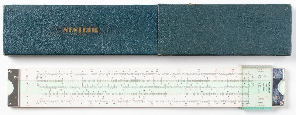 An excellent full sized Trig rule, great for high school students. All scales are self documenting on the right hand side. Nestler’s late production style duplex rule. BRAND NEW rule, with 2 part plastic case. Has normal and folded basic scales (at 3), expanded trig scales, and a 6 line cursor. Has green body supports, and a pale green stripe on the entire slide (both sides), and black and red filled/ engraved scales.