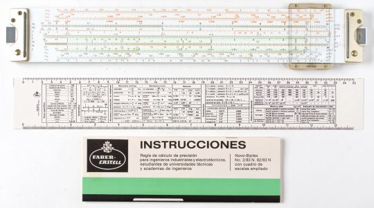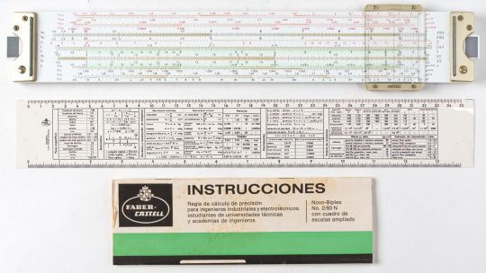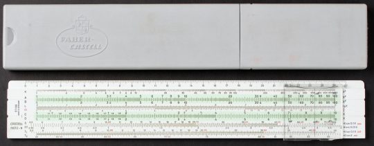 A beginner rule from Faber, featuring 5 cursor lines, an imperial ruler on the upper edge, and a reversible slide with additional scales. Comes with the original two-piece plastic case, and English instruction manual. Features the famous FC green scale contrast indicators, and black/red engraved scale markings. Moderate scale bleeding.