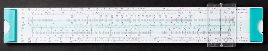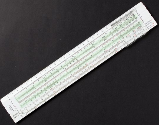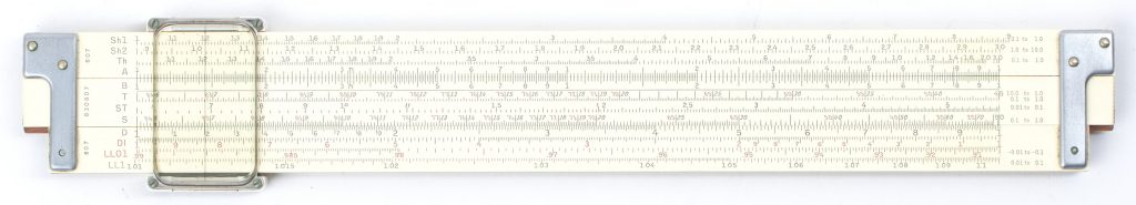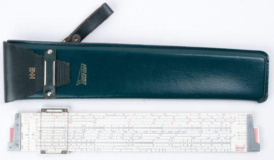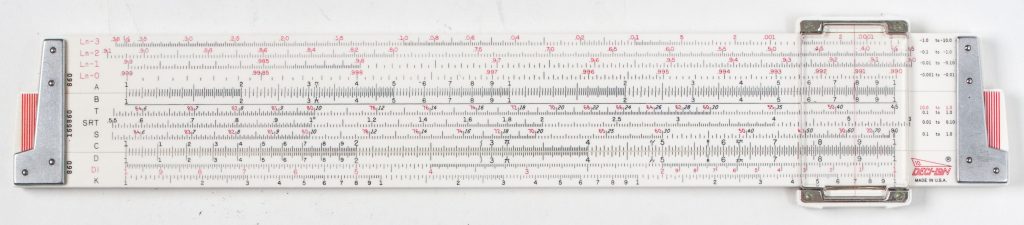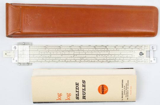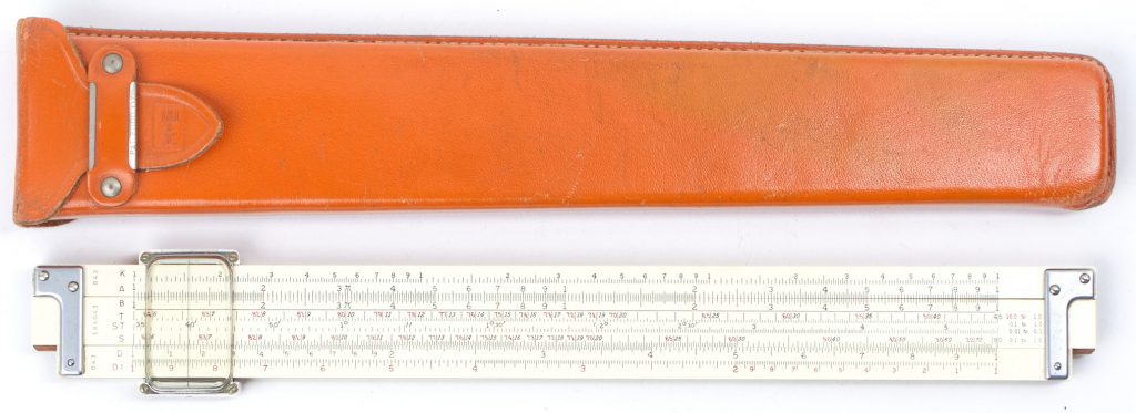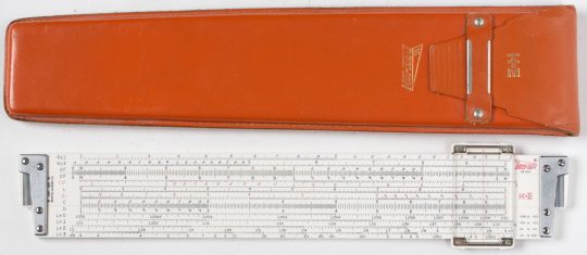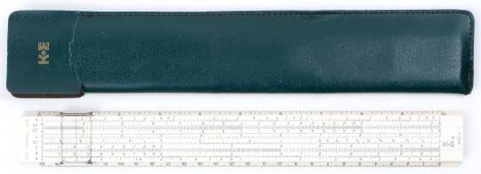 Considered to be the most advanced slide rule produced: gold anodized adjustable aluminum end braces, duplex 5/4-line cursor, two color (red/black) scale markings, and trademark mint green stripe on primary scales (both sides), plus additional blue stripes on the A and B scales, and massive 2 1/4″ wide body. Expanded W square root scales, for both the square root of x and 10x, 8 log log scales, and raised rubber bumpers to prevent cursor scraping, and to give the rule grip on a desktop. Body is fully alignable at the aluminum end-pieces, and provides finger grip areas on the slide for better movement. Cursor pops off (note the recess on the side bars) for easy cleaning, while retaining its alignment, a very handy feature! Rule is self documenting on right hand side for all scales. Has Pythagorean scale (P), expanded square scales, folded scales and scale over-ranges.