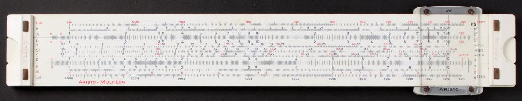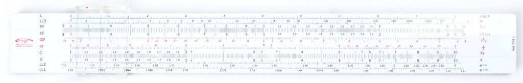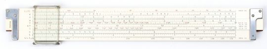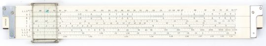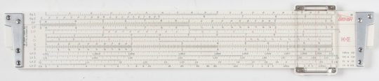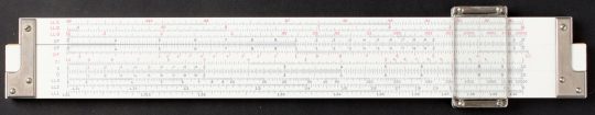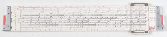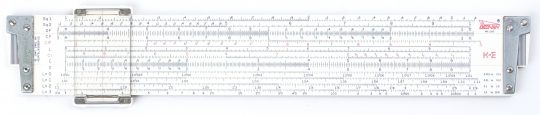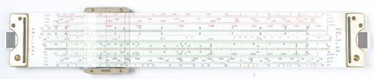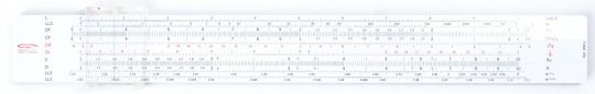 An advanced duplex log log rule, widely used in Europe, but seldom seen in North America. This rule has a plastic body, black and red filled and engraved scales, plus green accent stripes. This is a powerful design, with the Rietz over-range scale extensions, Pythagorean scale (P), and 6 log log scales. Scales are all self-documenting on the right hand side, and the rule has a 3/5 line cursor.