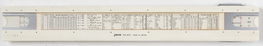 Front – Unsure on exact nomenclature of certain scales, but there are 9 scales including the two on lower edge of the ruler, and the following on the reverse side of the slide: S, S&T, T