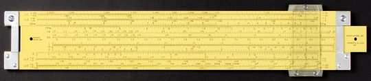 Has the Rietz over-range scale extensions, plus the Pythagorean scale (P), side log scale on the bottom edge. Slide reverse has 3 log log scales (ex), and two rear cursor windows. Scales are self-documenting.