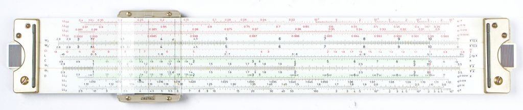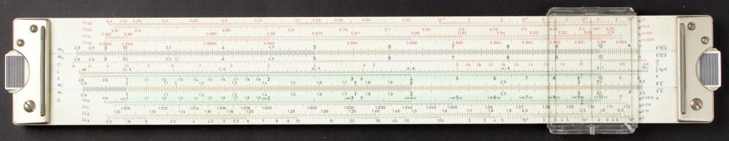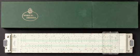 Faber Castell’s advanced duplex log log rule, widely used in Europe but seldom seen in North America, This rule has a plastic body with adjustable gold anodized aluminum end braces, black and red filled and engraved scales, plus green accent stripes. This is a powerful design with the Rietz overrange scale extensions, Pythagorean scale (P) 6 log log scales and w and W’ expanded square root scales. Scales are sall self-documenting on the right hand side, and the rule has a 5/6 line cursor.