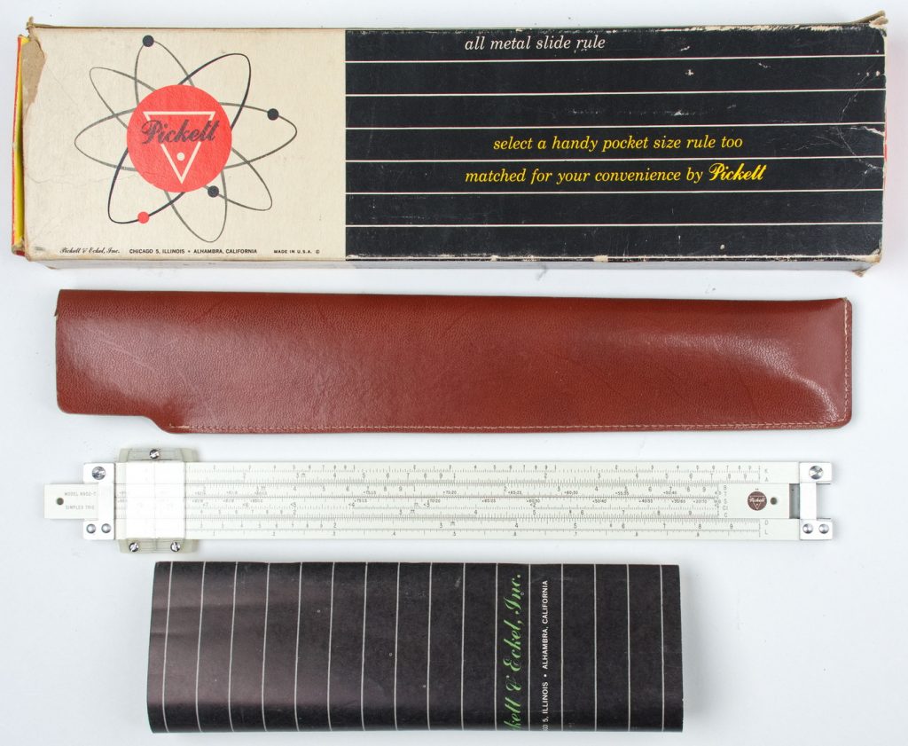 T (Traditional) White aluminum construction. Very high quality, American Made, Pickett rule. An excellent student rule with good trig capability, includes the original box, leather case, and instruction manual.