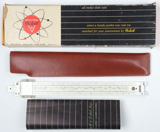 This is a very sophisticated 34 scale rule, made in the trademark aluminum body format by Pickett, an extremely powerful but somewhat crowded rule. Has hyperbolic scales, expanded trig, square and cube root scales, DI and two types of folded scales. Comes with the original brown leather case.