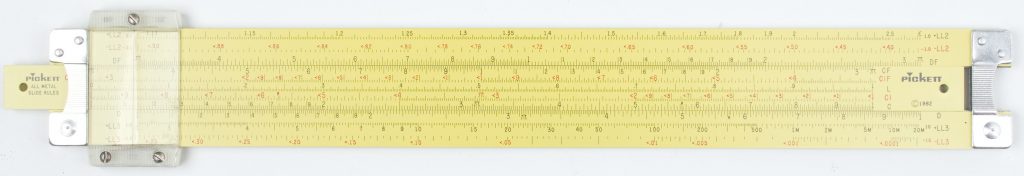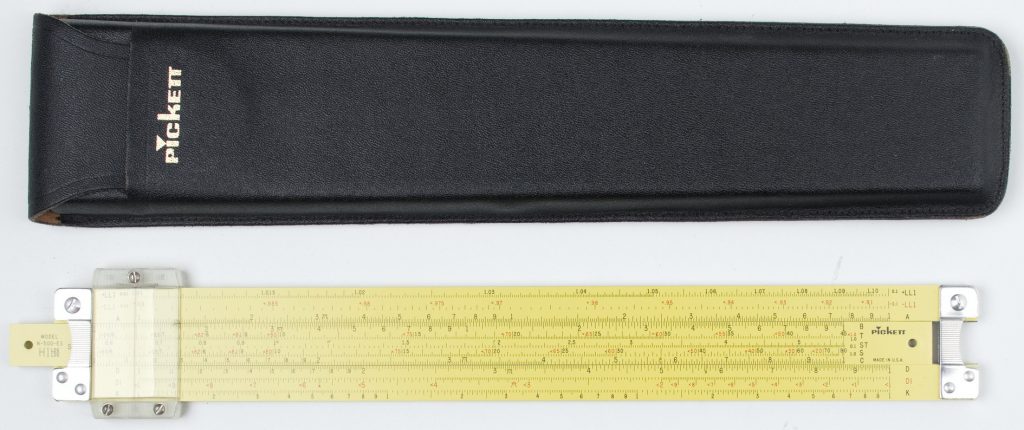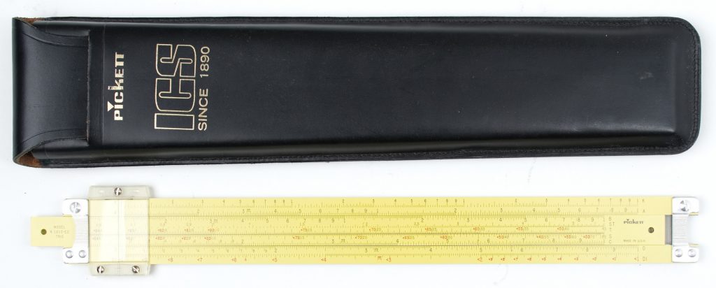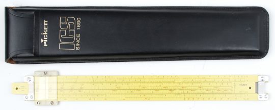 Eye-saver yellow (ES) coated aluminum construction, black and red scales. This is a very sophisticated Log Log rule, made in the trademark aluminum body format by Pickett. Comes with original Pickett leather case.