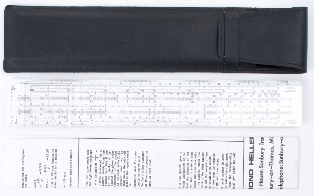 Includes original user manual and leather case. in black or tan. Dual log scale design with repeated C/D scales and DI scale for ease and speed of use.