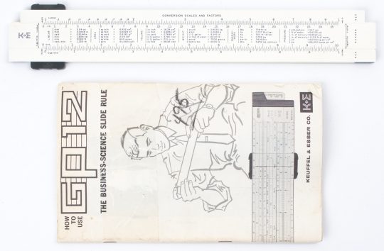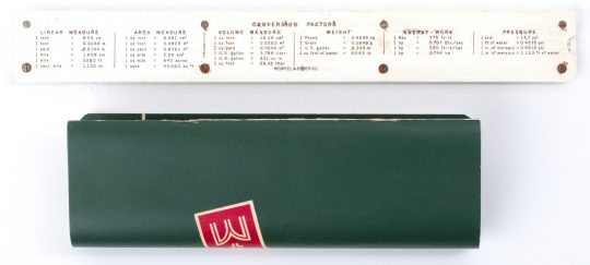 An unusual business rule in new condition, with original instruction manual, but missing its case. Scales are engraved and filled with red/black, as well as being self-documenting on the right side of the rule. Features an imperial rule on the upper edge, and specialist scales for currency conversion, and unit/measure conversions.