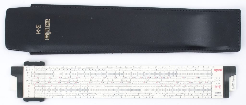 K+E’s famous Deci-Lon duplex rule, in very good condition, with very good orange sewn leather case, and supplementary instruction/formula sheets. This is K+E’s late production flagship rule, with unbreakable cursor, Ivorite body and adjustable frame, all free of marks, names or initials. Has 8 log log scales, a split square root scale, DI and folded scales. An outstanding and powerful rule, cleverly designed.
