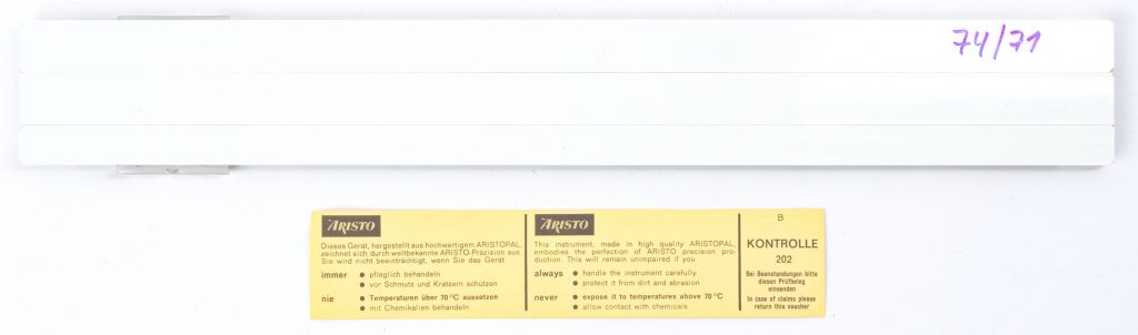 This 13-scale full size rule features large, color contrasted scale for easy reading, and operating instructions printed on the reverse side of the rule. Includes the original case and operating instructions (in German).