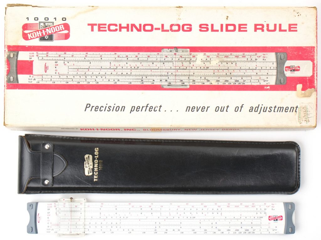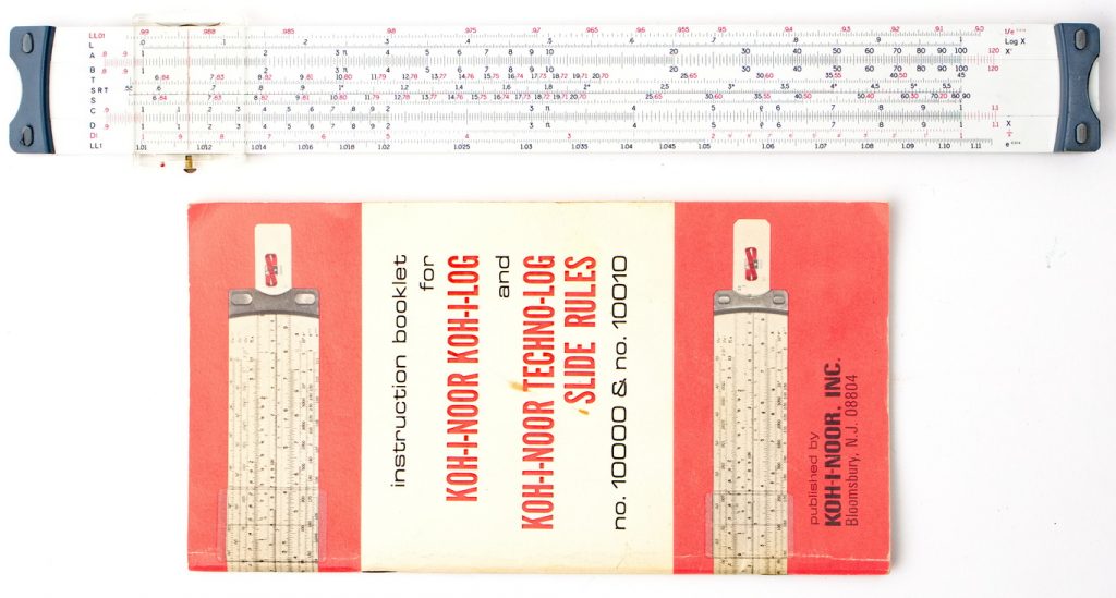 NIB, mint condition student/beginner rule with the original box, case, and manual (English). Scales are self-documenting on the right side of the rule. Features a metric ruler on the upper edge, and operating instructions on the reverse side of the rule.