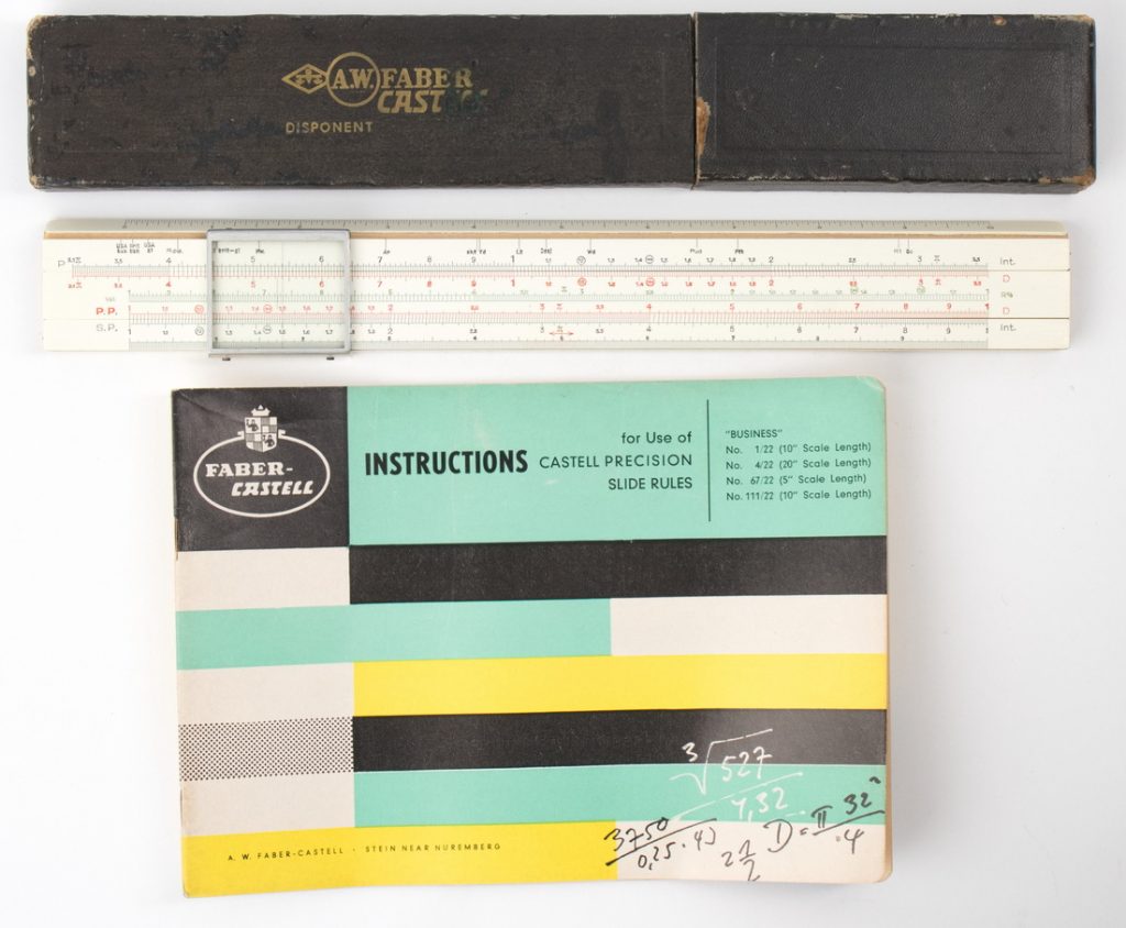 Considered to be the most advanced slide rule produced: gold anodized adjustable aluminum end braces, duplex 5/4-line cursor, two color (red/black) scale markings, and trademark mint green stripe on primary scales (both sides), plus additional blue stripes on the A and B scales, and massive 2 1/4″ wide body. Expanded W square root scales, for both the square root of x and 10x, 8 log log scales, and raised rubber bumpers to prevent cursor scraping, and to give the rule grip on a desktop. Body is fully alignable at the aluminum end-pieces, and provides finger grip areas on the slide for better movement. Cursor pops off (note the recess on the side bars) for easy cleaning, while retaining its alignment, a very handy feature! Rule is self documenting on right hand side for all scales. Has Pythagorean scale (P), expanded square scales, folded scales and scale over-ranges. Includes: Original box, case, original manual in Spanish, reprint manual in English, and accessory rule.