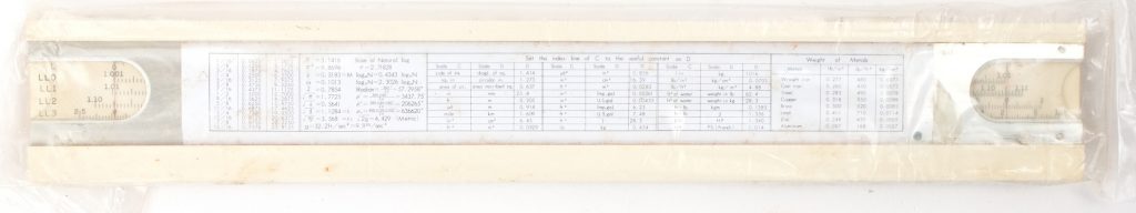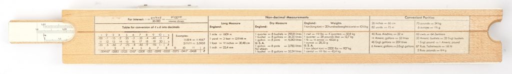 Commerce/Business rules are not very common in North America, but were widely used in Europe. It is set up to do Mark-up/Discount, simple and compound interest, currency and common unit conversions and all the normal math functions, plus log log scales on the slide reverse. Features an imperial ruler along the top edge, and a £/$ conversion scale with cursor along the lower edge. The rule is self documenting on right hand side for all scales. A very good quality rule with black, red, and green scale markings. Mint condition sets, and this business style rule doesn’t show up very often, especially with the unique currency scales and marks. Conversion factors and references on the reverse side.