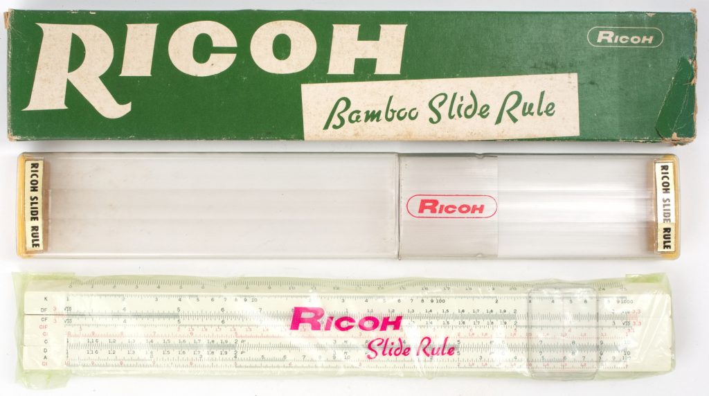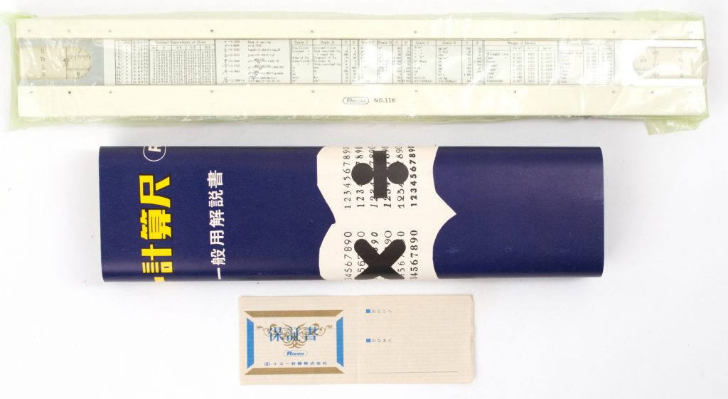 This is a NIB Ricoh 116, featuring a transparent plastic case and original manual. Factory box is missing a flap and has signs of wear. This is an excellent student rule or engineering rule that features a metric ruler along the upper edge and a variety of formula and technical references on the reverse.