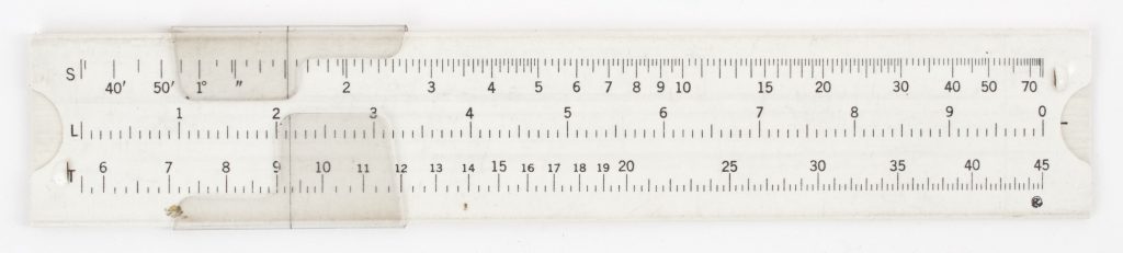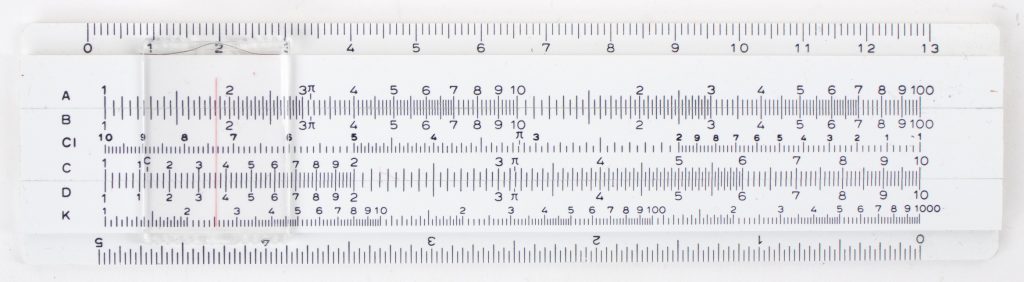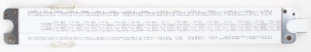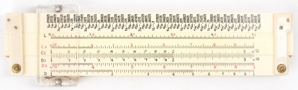 Front: – C, CI, A, K, L, Log Log (1.0015-1,000,000), fractions, fractions, drill/thread, mm