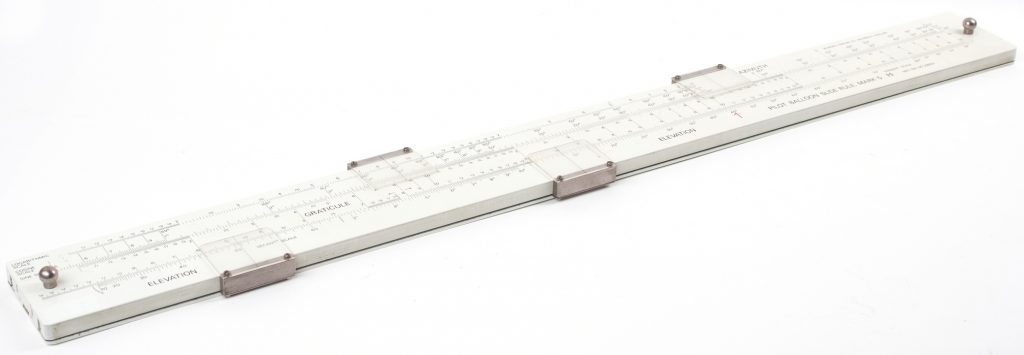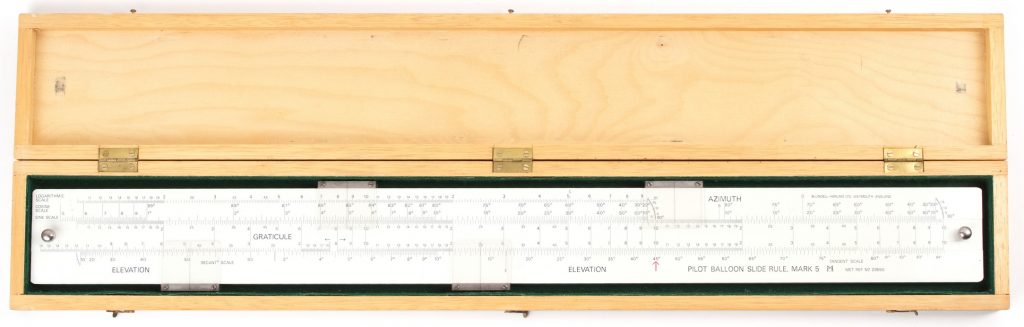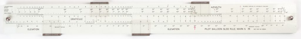 This is a Mark 5 Pilot Balloon Slide Rule manufactured around 1968. It measures 63cm[24.75in] long, 6.3cm[2.5in] wide and 12mm[0.5in] thick. The printed scales are engraved in the plastic faces. The slide rule has 4 captive cursors that ride in slots on the top and bottom edges. Each can be moved independently of one another. Steel knobs at both ends of the slide facilitate movement of the slide. These were made for and used by UK Government agencies, and not individuals. The Met.(meteorological) Office of the United Kingdom designated at least 6 different Pilot Balloon slide rule models. The first model in appearing 1915 made of wood by J.J. Hicks with two slides and introduction of the final, MK 5 model in the Late 1960’s.