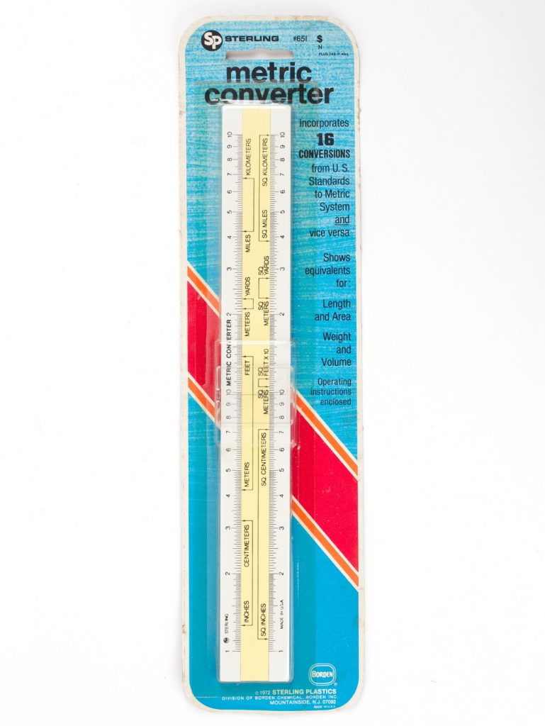 This is a desktop / countertop conversion tool that uses three dials to convert mass and volume, and a scale for temperature. Originally meant for use in the kitchen, but just as good for other purposes.