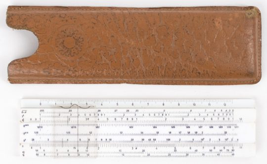 An unusual pocket rule from Eastern Europe, this rule’s scale markings do not use standard notation, and instead just mark out the actual functions (similar to Koh-I-Noor rules). Includes leather slip case.