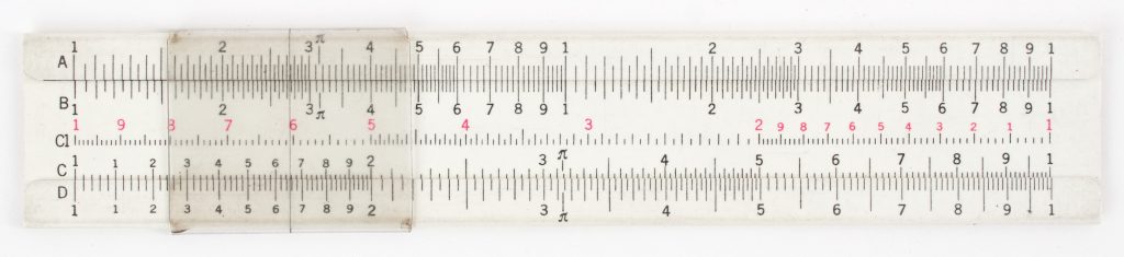 White plastic body and end braces with engraved and filled scales in red/black. Folded scales are at 3, with Pi also marked. Front ABCD scales also have over-range at both ends.