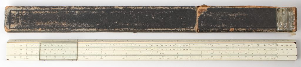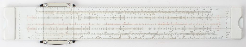 A more advanced rule, featuring a plastic body, with hybrid metal/plastic cursor. Red and black engraved scales, self-documenting on the right side of the rule. Includes original plastic case.