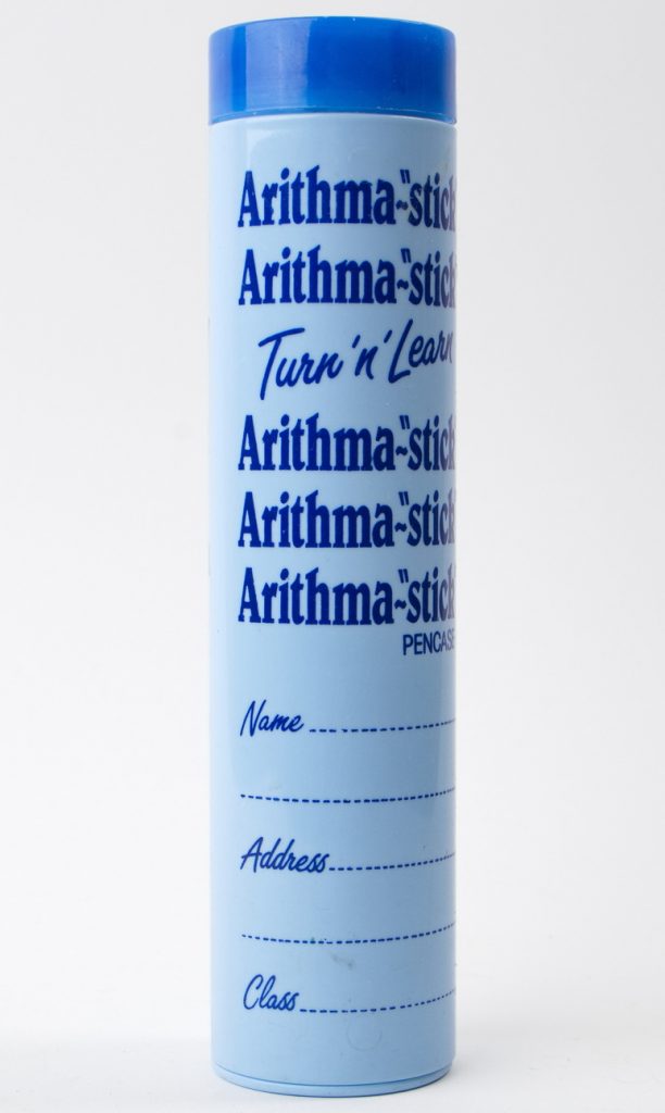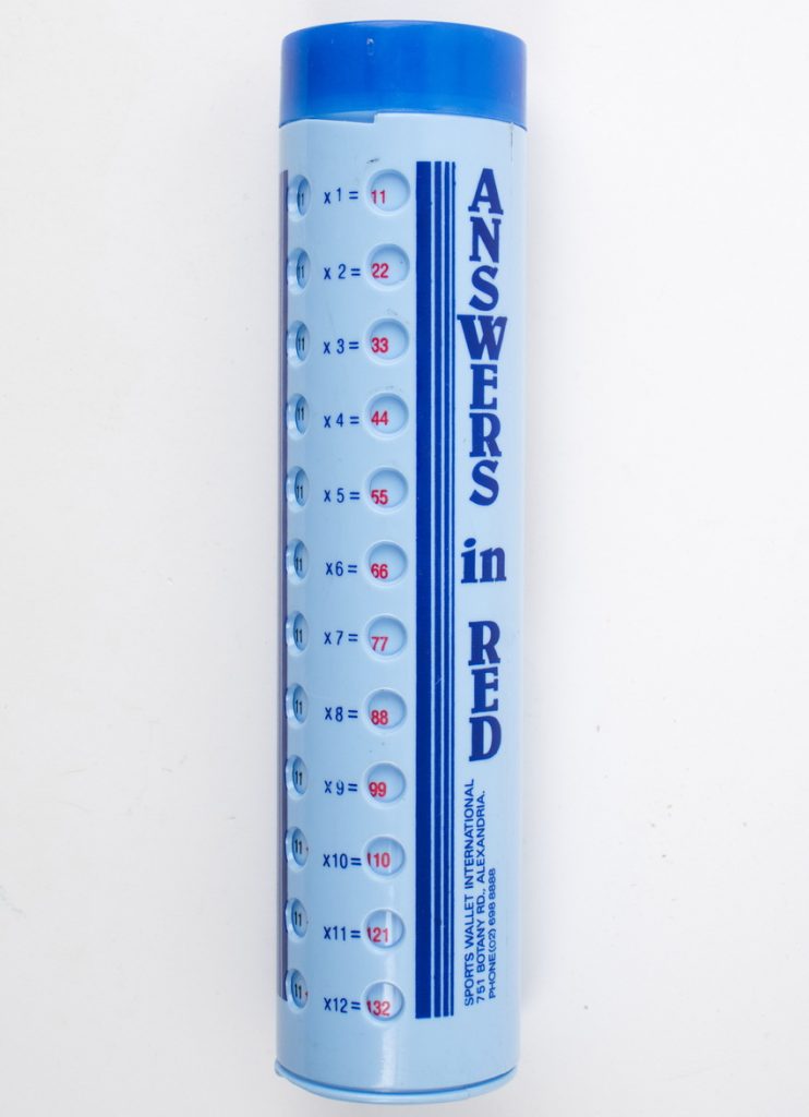 A novel pen case from Australia, that reads out multiplication tables from 1 to 12 using an internal rotating cylinder.