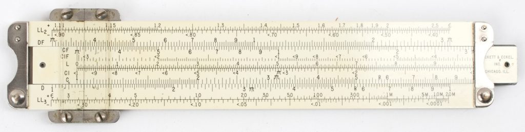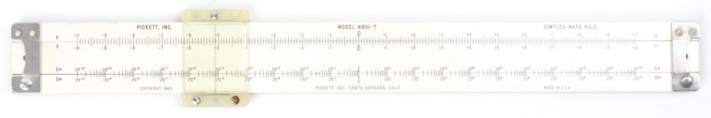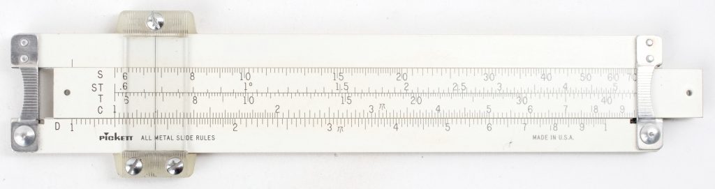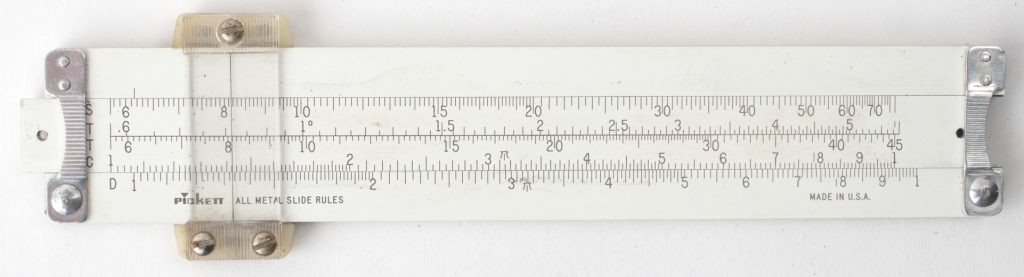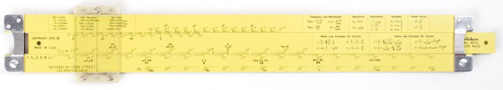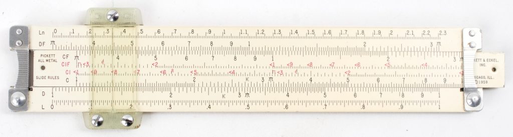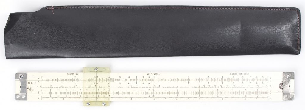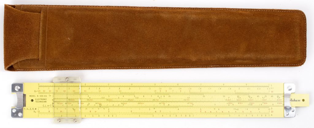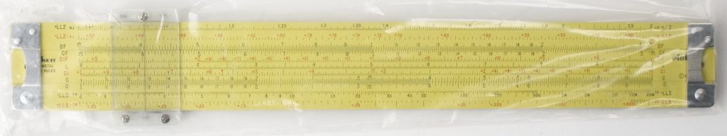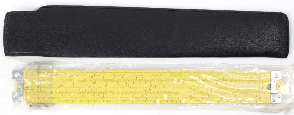 ES (Eye-Saver) Yellow aluminum construction, high-quality American made, Pickett rule. An excellent student rule with good trig capability, that never loses its instruction manual (it’s printed on the back).