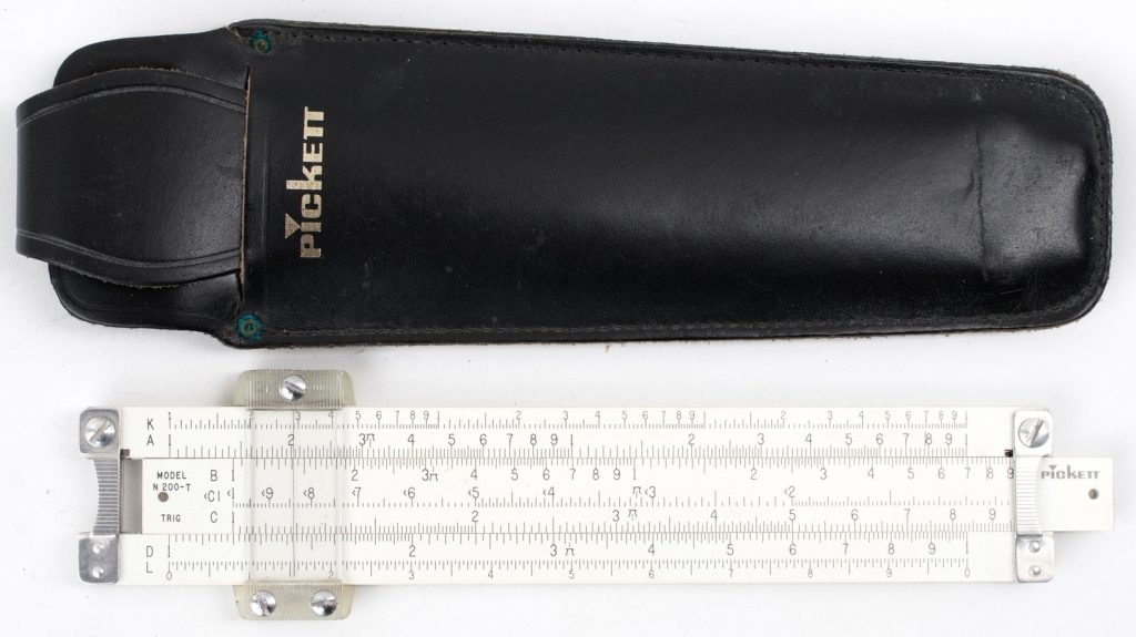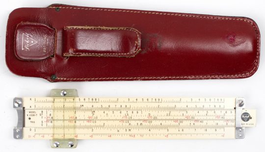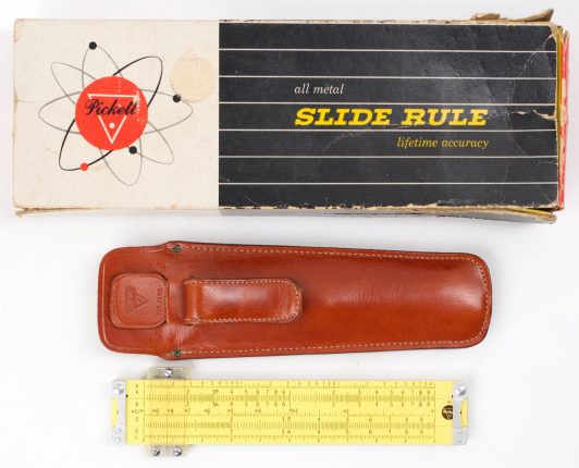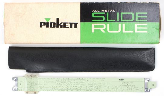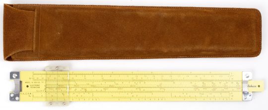 Eye-saver yellow (ES) coated aluminum construction, black and red scales. This is a very sophisticated Log Log rule, made in the trademark aluminum body format by Pickett. Comes with original Pickett box, embossed brown leather case, and manual.