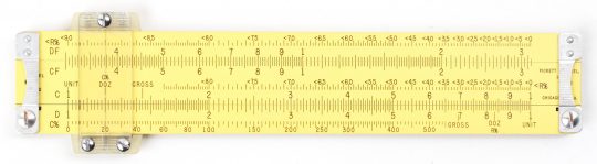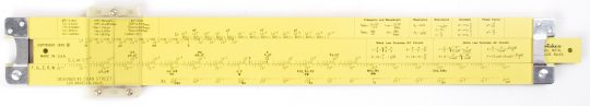 This is a very thorough and intuitive conversion set created by Pickett which uses interchangeable discs secured by a thumb screw to modify the rule for different unit conversions. The rule also features C & D scales for multiplication and division.