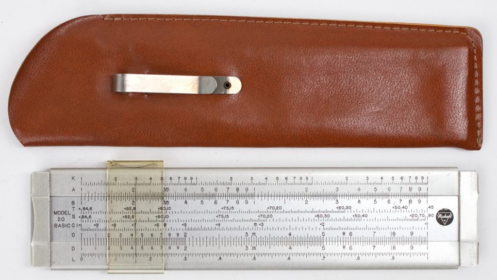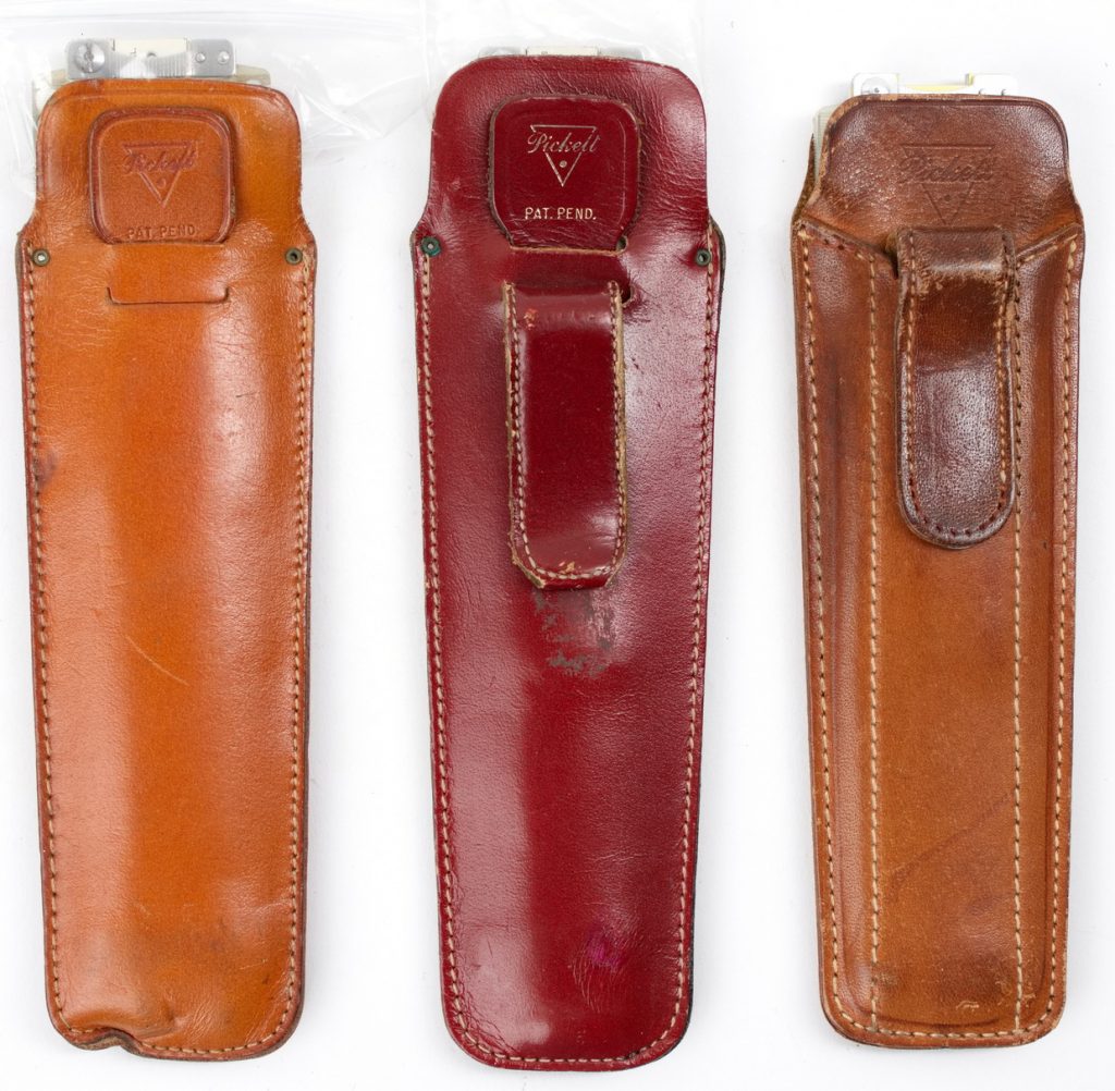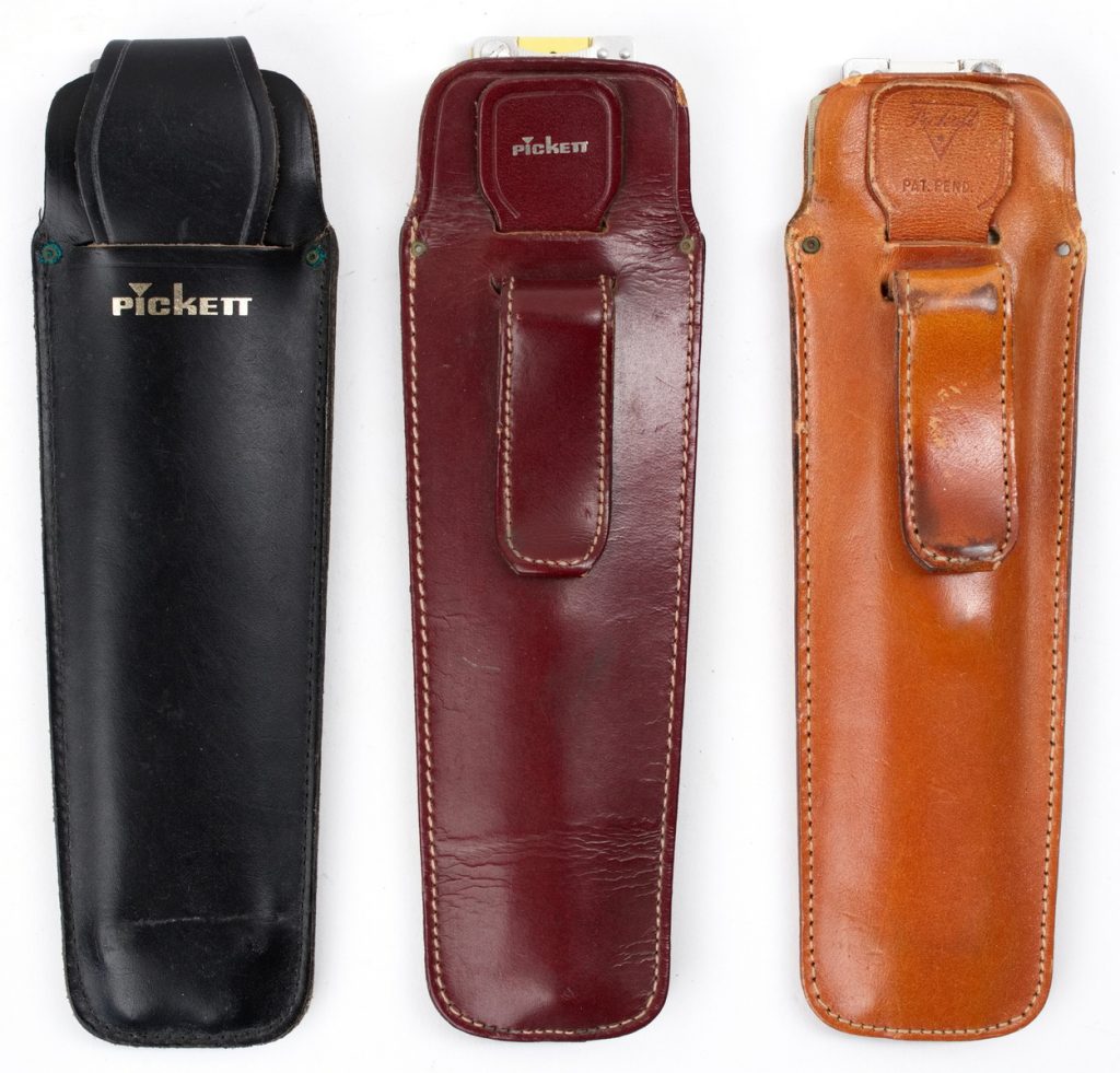 Pocket Duplex Log Log Speed Rule, Pickett’s most powerful compact rule with an amazing 22 scales, black and red scales, aluminum construction! These are used rules that come in a variety of different leather cases, with either a pull tab or clip case.