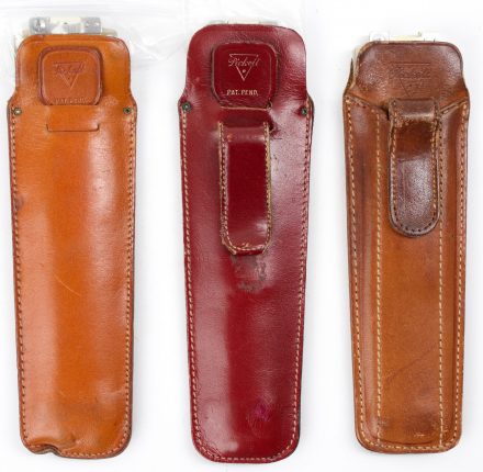 Pocket Duplex Rule, aluminum/magnesium bodies, some rules have promotional logos. Includes original leather cases, some with pull tabs, clips, or slip cases.