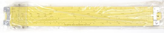 New and in the original factory plastic, the this 531 is an all aluminum rule in Pickett’s Eye Saver (ES) yellow, featuring black scales. This specific rule was made for the Capitol Radio Engineering Institute.