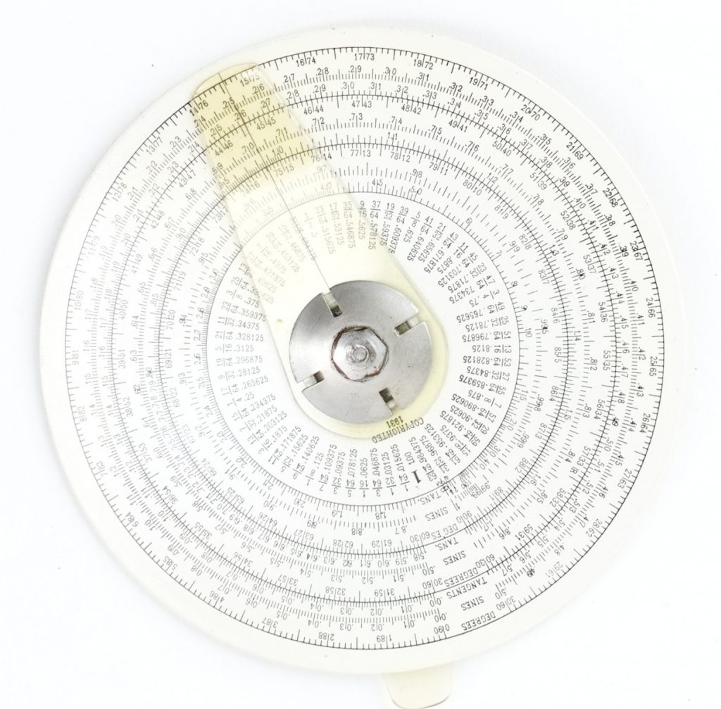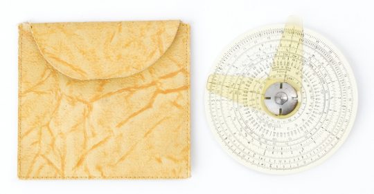 A more advanced, but still very clean looking and easy to read circular slide rule. Includes original vinyl slip case and instruction manual.