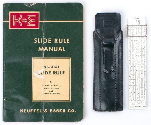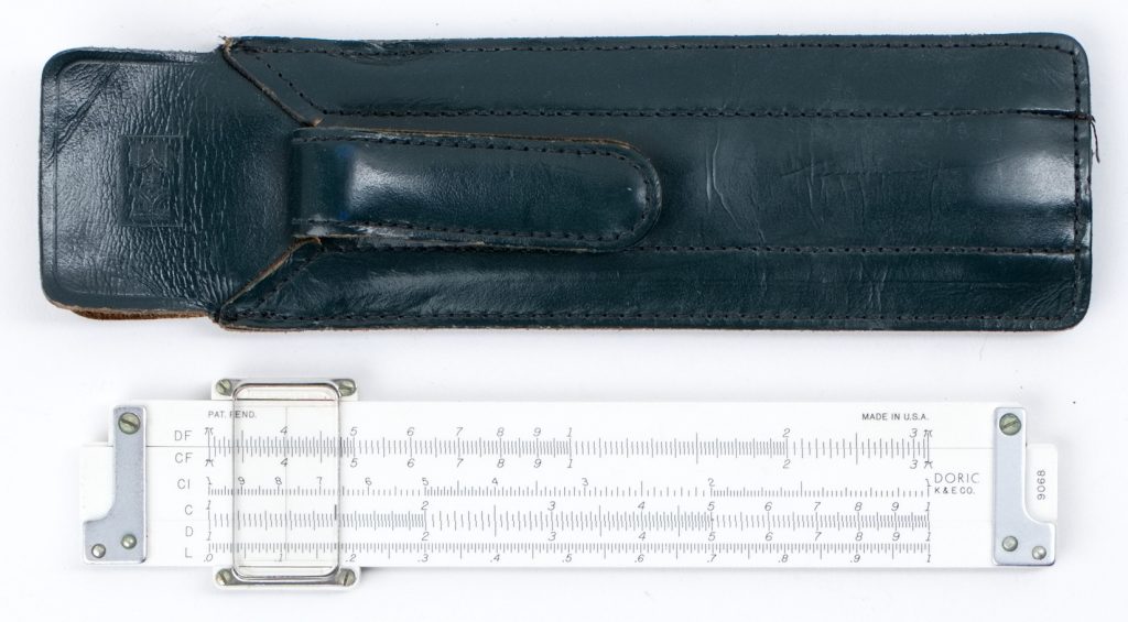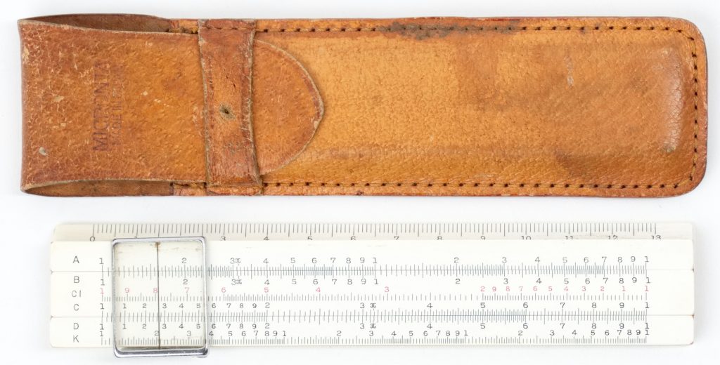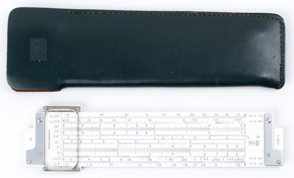 This is an early version Ivorite body Jet Math Pocket rule from K+E, with green leather pocket sheath case, and softcover manual.