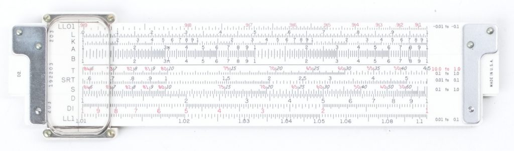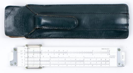 New condition, late production rules, complete with black vinyl slip case. An excellent plastic body pocket rule with 4-line cursor, two color (red/black) scale markings, green accent stripes on C and CF scales, folded main and expanded trig scales. CF/DF scales also marked for mark-up/discount. The rule is self documenting on right hand side for all scales. A very powerful and beautifully made pocket rule with green end braces.
