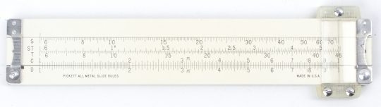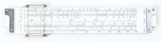This K+E pocket rule has an unbreakable improved cursor and white body with black engraved and filled scales. A very attractive rule, and complete in a factory boxed set. This rule has folded (CF/DF) scales at pi, with the trig scales in decimal degrees. The back is blank, but the slide is reversible with trig scales (T, ST, S, C). The pic shows the actual box condition, and all the parts offered for sale.