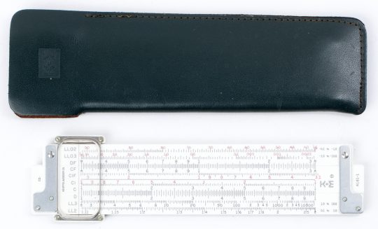 A very capable pocket rule with Log-Log scales, self-documenting on the right, and two rulers (front and back). Comes with the original leather slip case, and English instruction manual. Features the standard FC black/red engraved scale markings. Moderate scale bleeding.